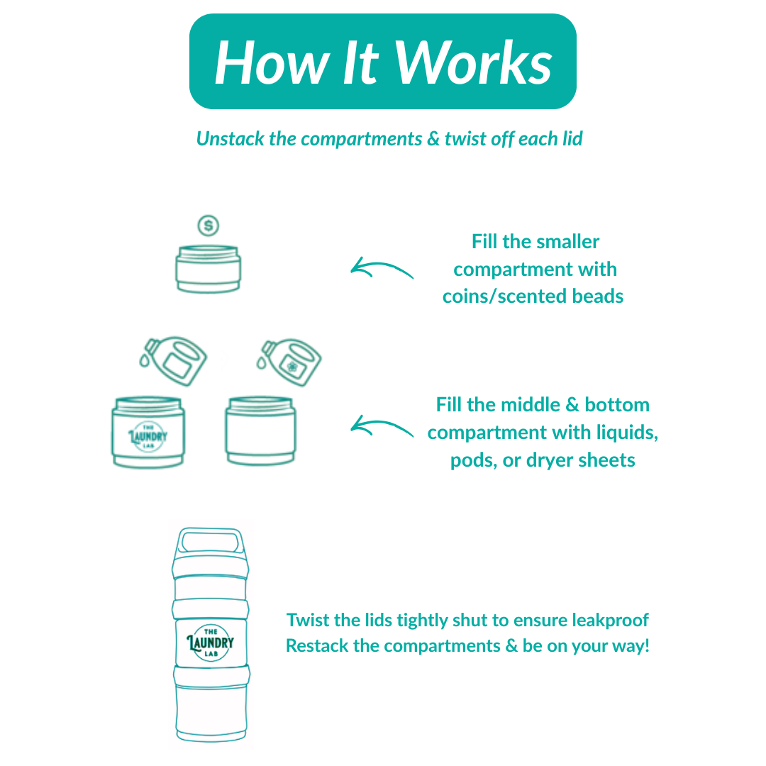 Have an injury, but I am finally able to do a light load of laundry with the help of a tall rolling cart I bought from Amazon as well. This works well and helps to have everything essential and not need to lug around three different bottles or containers with me. It is good quality and tightly closed, so I had to not close it so tightly because then I wouldn�t be able to open it. I use pods and the scented pebbles, so those were good. Only the odor rinse is liquid for me, and it was upright, so nothing spilled. Each container is a good size for what I needed, and I still had left for another two washes. Simple item, big help. Purchase!